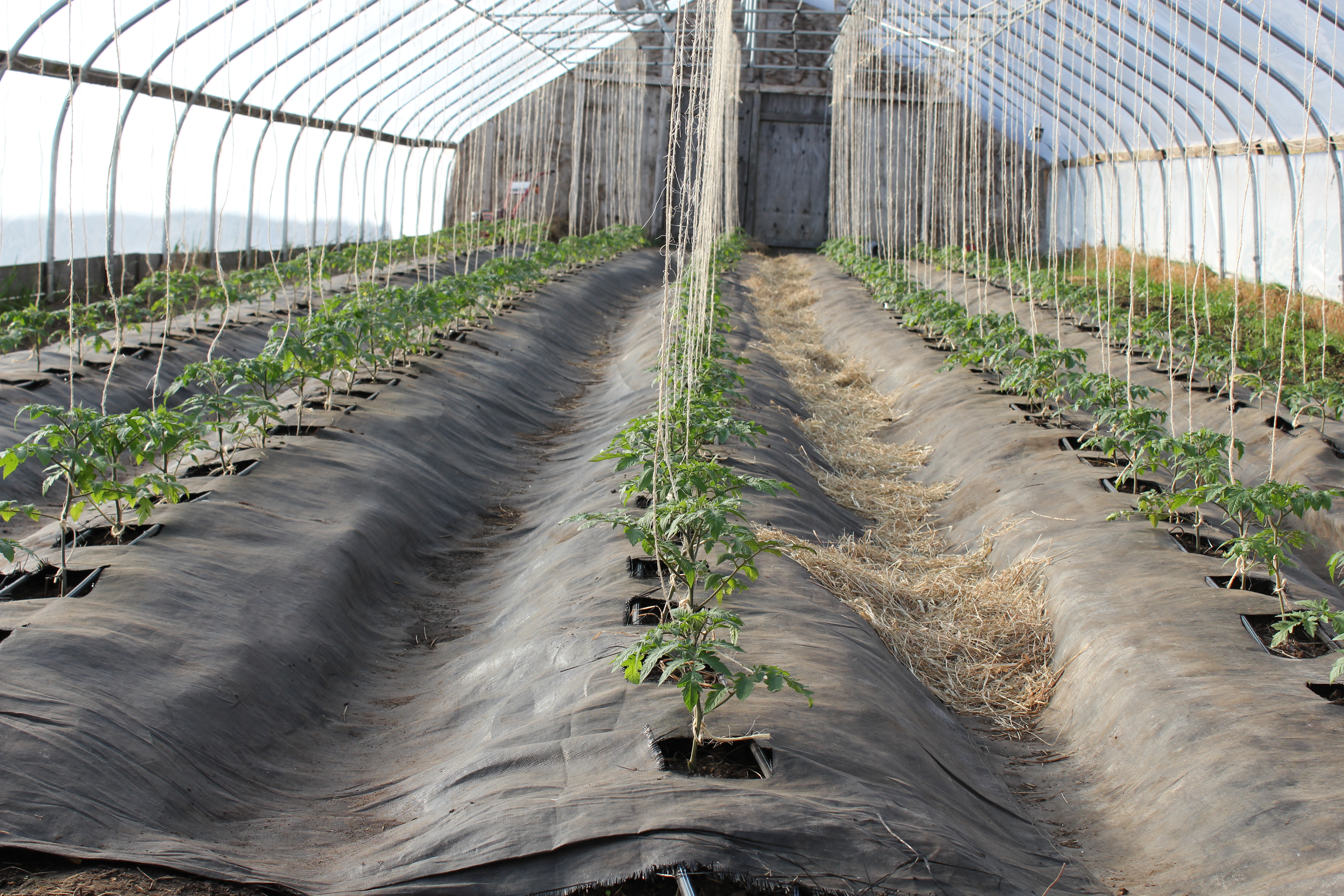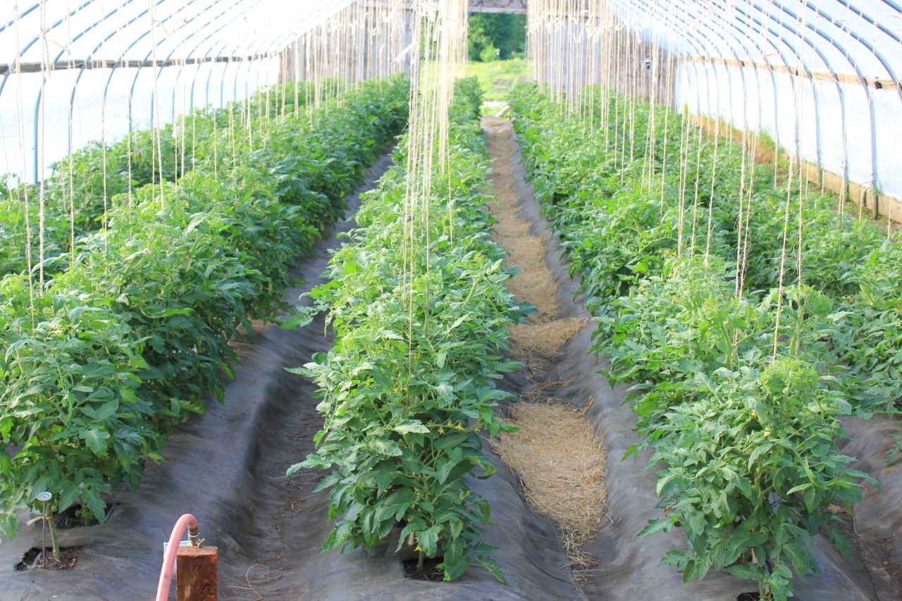 One of my favorite times of the planting season is seeing the heated greenhouse planted with “big beef” tomatoes and trellised. This is the beginning of their 7 week journey of growing, being suckered and then producing my favorite food of the season. One of the ways my days are fulfilled through the summer months is walking through the greenhouse, finding a ripe tomato, taking out my knife and coring, eating and then wiping the juice, which has dripped down my beard, with my hand or arm and continuing my day until my next venture into the greenhouse. As far as my being a tomato snob, it is very true. As the season goes along and the other varieties of tomatoes are planted in another greenhouse in late may, the crew and I always do a taste test. The other greenhouse will be filled mostly with heirloom tomatoes, with varieties such as Paul Robeson, our favorite tasting tomato on the farm, pineapple, the most beautiful, a yellowish-orange tomato with red variegation throughout the center,and numerous other unique tasting tomatoes.